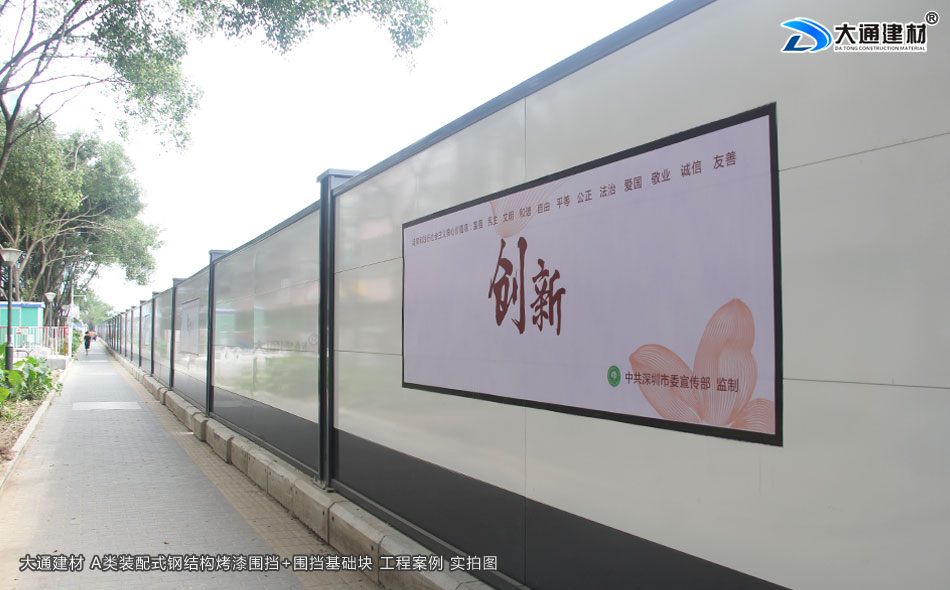 大通建材A類裝配式鋼圍擋,堅(jiān)持深圳質(zhì)量,關(guān)注城市美學(xué),培育精益求精的工匠精神,結(jié)合深圳開放、創(chuàng)新、現(xiàn)代、濱海的城市的特征和公益宣傳的要求。提供具備不同區(qū)域環(huán)境特點(diǎn)的外觀設(shè)計(jì)方案,外觀顏色可以是白色+深灰色烤漆擋板(亦可是全白色烤漆擋板),美觀大氣的現(xiàn)代風(fēng)格;再結(jié)合城市區(qū)域特點(diǎn),分片區(qū)、分道路、分街景各自選用同類風(fēng)格圍擋,營造美觀、整潔的城市環(huán)境的同時(shí),實(shí)現(xiàn)圍擋風(fēng)格區(qū)域性的協(xié)調(diào)統(tǒng)一。