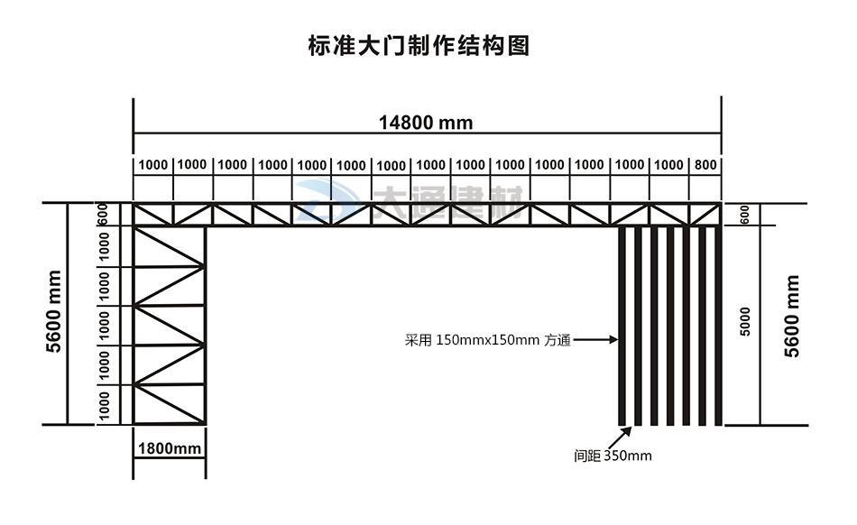 深圳市大通建材有限公司是一家專業(yè)生產(chǎn)標準工地大門廠家,今天小編與大家一起看看大通建材生產(chǎn)的標準工地大門的常規(guī)款式有哪些吧。大通建材常規(guī)款式的標準工地大門規(guī)格尺寸:14.8米寬x5.6米高 具體參數(shù)如下展示的尺寸規(guī)格圖