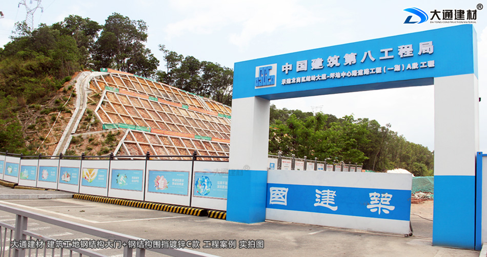 中國(guó)建筑八局集團(tuán)在深圳市龍崗區(qū)蛇嶺大道坪地中心路道路工程(一期)A段的工程項(xiàng)目,選用了深圳市大通建材生產(chǎn)的鋼結(jié)構(gòu)工地大門為項(xiàng)目部大門。