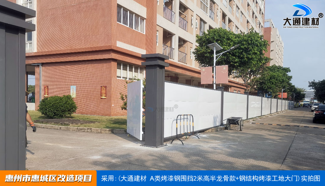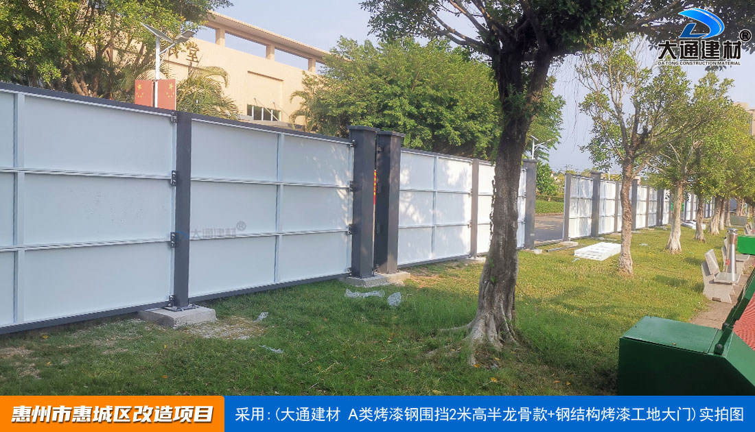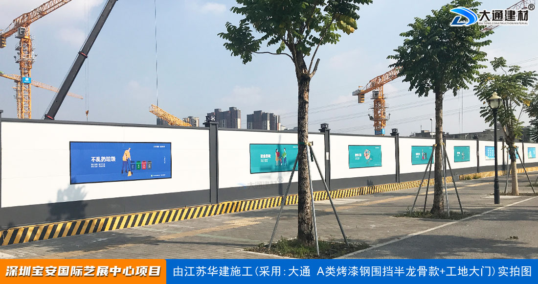 建設工程施工工地四周應按規定設置連續、密閉的鋼結構施工圍擋,建造多層、高層建筑的還應設置安全防護設施。在市區主要路段和市容景觀道路及市場、機場、碼頭、車站廣場等人流量、車流量比較多的地方設置的施工圍擋的高度不得低于2.5m,在其它路段設置的圍擋的高度不得低于1.8m。而深圳市大通建材A類鋼圍擋烤漆半/無龍骨款的標準高度是2.5米、長度為6.3米一擋,而圍擋高度特殊需求的如3//4//5/6/米等高度的可以進行定制化生產。