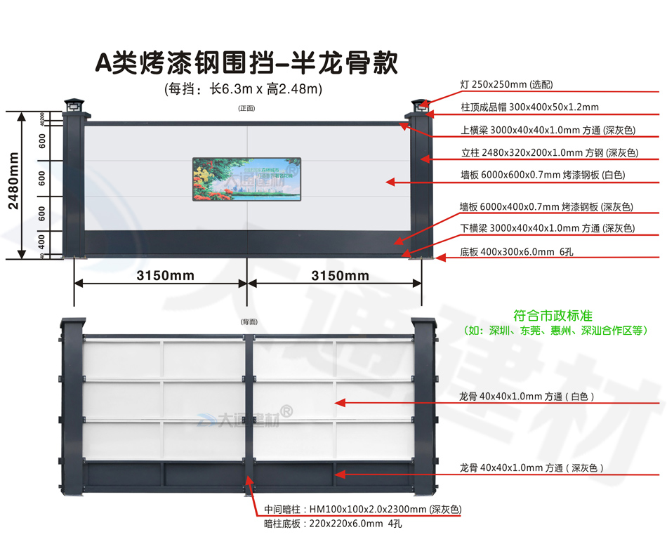 大通建材A類鋼結構烤漆圍擋半/無龍骨款適用于市政建設施工、房地產項目施工、地鐵項目施工、管網改造、小區改造、城市建設、道路施工等工程使用