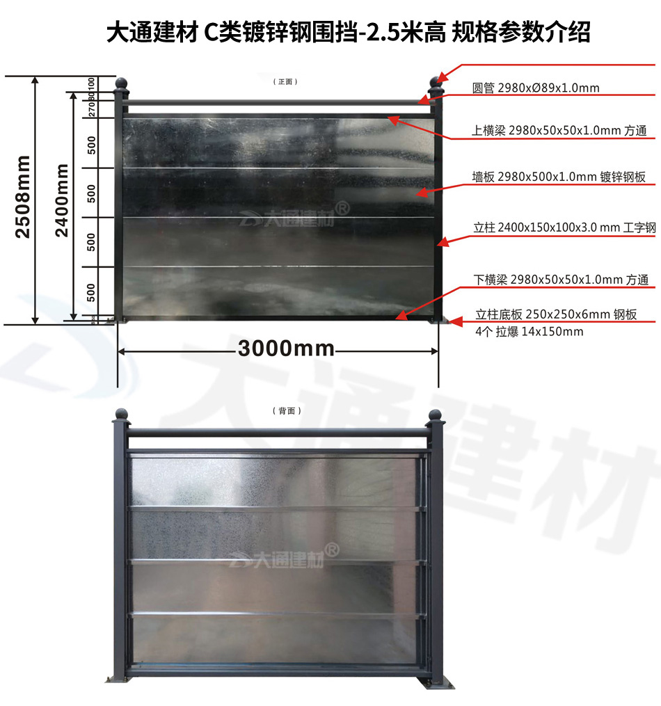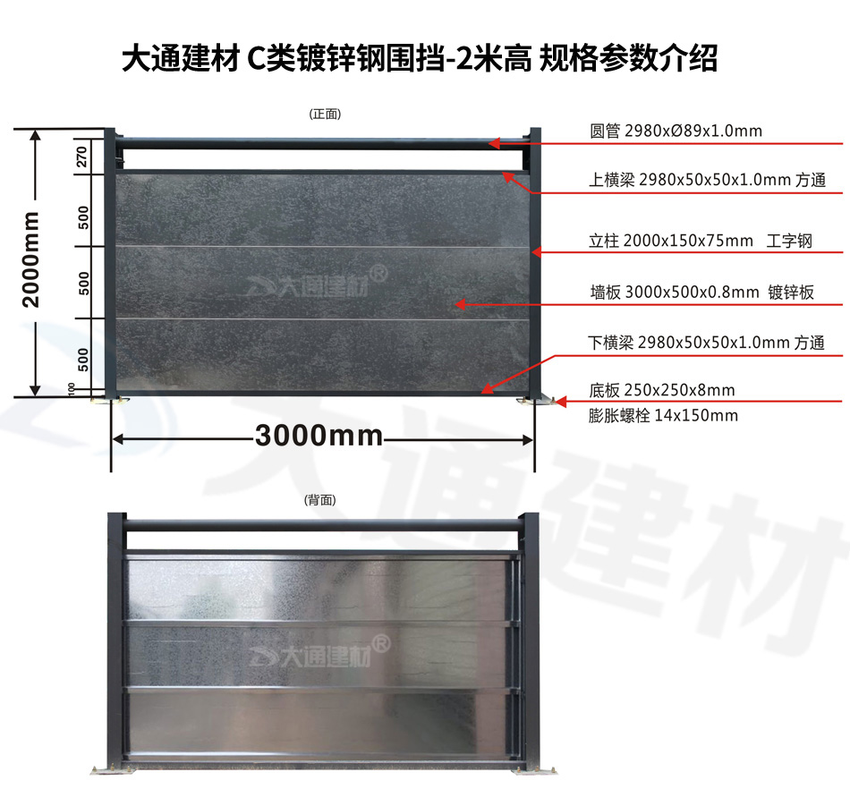 | 大通建材 C類鋼結(jié)構(gòu)圍擋-鍍鋅板款(每擋:長(zhǎng)3米、高2.5米)規(guī)格參數(shù) | |||||