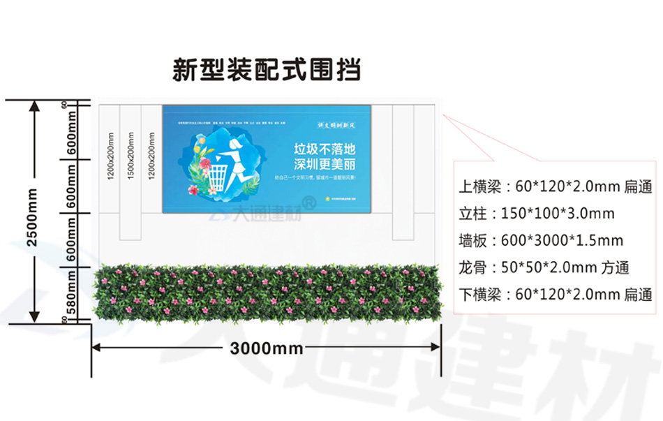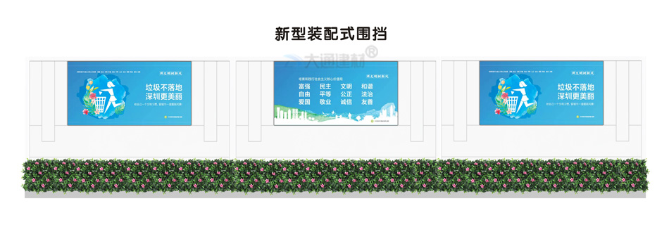 深圳市大通建材生產的 新型裝配式圍擋+高檔綠植圍擋,符合深圳市住建局統(tǒng)一要求的圍擋標準,常規(guī)尺寸的圍擋有現(xiàn)貨,而對圍擋尺寸、顏色等有特殊要求的可按實際需求定制化生產,了解更多“大通圍擋規(guī)格與價格”的詳情 請致電咨詢 13826562448 梁先生